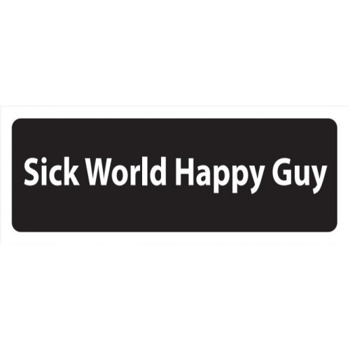 Helmet Sticker 'SICK WORLD HAPPY GUY' White Bold Letters on Black Background.