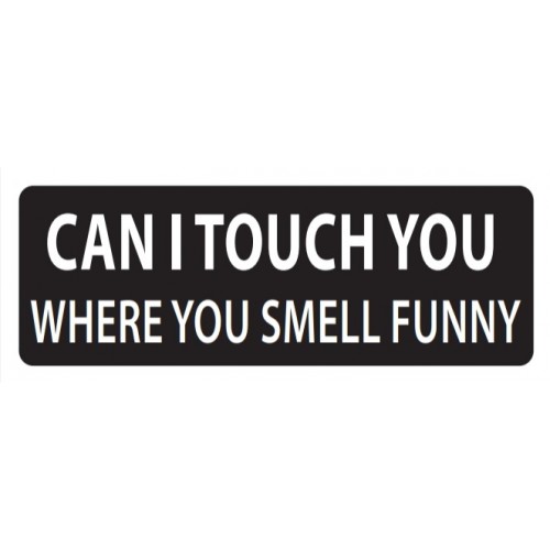 Helmet Sticker 'CAN I TOUCH YOU WHERE YOU SMELL FUNNY?' White Bold Letters on Black Background.