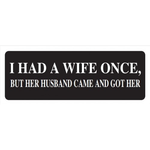 Helmet Sticker 'I HAD A WIFE ONCE BUT HER HUSBAND CAME AND GOT HER' White Bold Letters on Black Background.