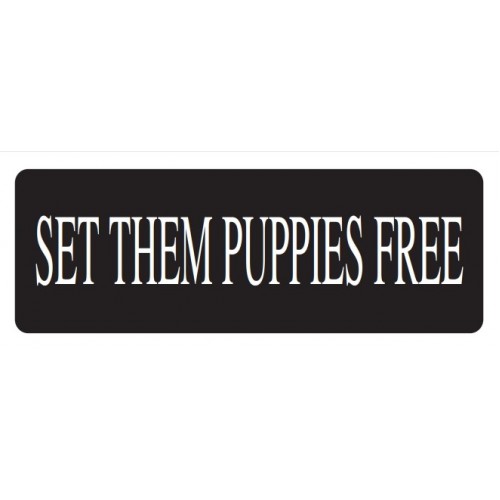 Helmet Sticker 'SET THEM PUPPIES FREE' White Bold Letters on Black Background.