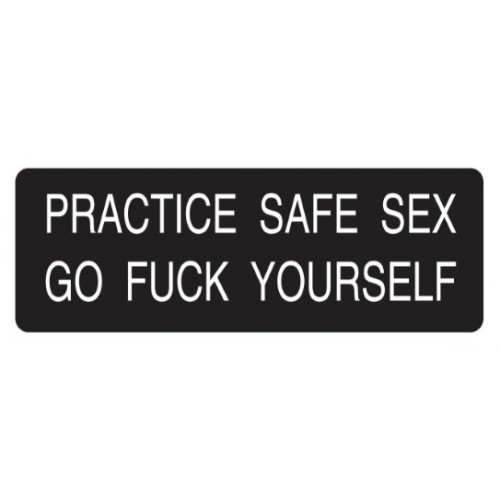 Helmet Sticker 'PRACTICE SAFE SEX GO FUCK YOURSELF' White Bold Letters on Black Background