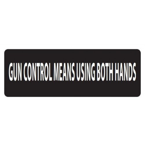 Helmet Sticker 'GUN CONTROL MEANS USING BOTH HANDS' White Bold Letters on Black Background