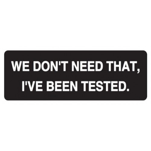 Helmet Sticker 'WE DON'T NEED THAT, I'VE BEEN TESTED' White Bold Letters on Black Background