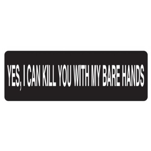 Helmet Sticker 'YES, I CAN KILL YOU WITH MY BARE HANDS' White Bold Letters on Black Background