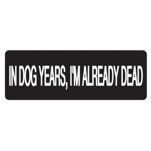Helmet Sticker 'IN DOG YEARS, I'M ALREADY DEAD' White Bold Letters on Black Background