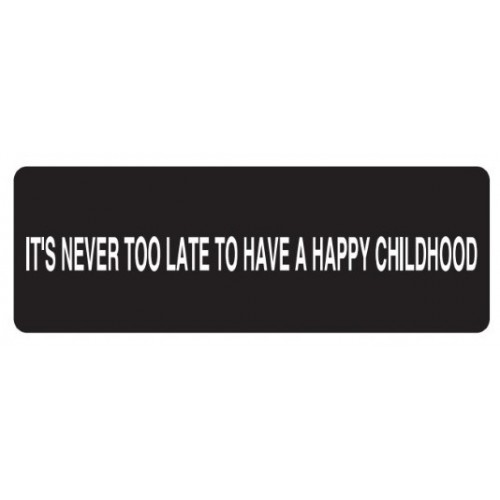Helmet Sticker 'IT'S NEVER TOO LATE TO HAVE A HAPPY CHILDHOOD' White Bold Letters on Black Background