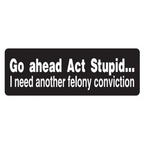 Helmet Sticker 'GO AHEAD ACT STUPID...I NEED ANOTHER FELONY CONVICTION' White Bold Letters on Black Background